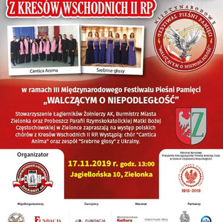 Однією з подій для розвитку творчої особистості став «ІІІ Міжнародний фестиваль пісенних пам’яток «Борцям за незалежність», котрий відбувся 16 листопада цього року у Військовому технологічному університеті міста Варшава Республіки Польща. У цьому фестивалі безпосередньо брали участь колективи з України, Білорусії та Литви. Україну представляли вокальний ансамбль «Срібні голоси» з міста Вінниця та хор «CANTICA ANIMA» з міста Бар, котрий функціонує на базі Польського дому.